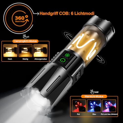【2 SCHALTER & 10 LICHTMODI】Mit dem doppelten taktischen Schalter können Sie die Beleuchtung für verschiedene Outdoor-Szenarien frei einstellen. Mit nur einer taschenlampe led aufladbar können Sie im Handumdrehen von einem starken Scheinwerfer für regnerische Pfade zu einer sanften COB-Campinglampe für Ihr Zelt wechseln. Oberer Schalter: Hoch/stufenlose Dimmung/Strobo/SOS. Unterer Schalter: 3 Campinglampenmodi (hell – mittelhell – Atemlicht) + 3 Warnlichtmodi (rotes Licht – blaues Licht – abwechselnd rotes und blaues Blinklicht). Zuverlässige Beleuchtung, immer griffbereit.