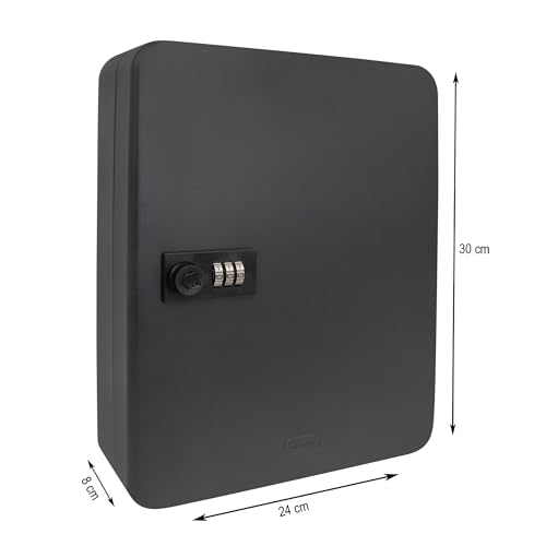 Der sichere Schlüsseltresor aus robustem Stahl hat eine kompakte Größe von ca. 30 x 24 x 8 cm und ist mit 36 Schlüsselhaken ausgestattet, ideal zum Verstauen, Verwahren und Ordnen von Schlüsseln aller Art. Das individuell einstellbare, 3-stellige Zahlenschloss sorgt für eine sichere Aufbewahrung deiner Schlüssel. Zusätzlich sind 36 farbige Schlüsselanhänger aus Kunststoff und 54 Zahlenaufkleber zum Kennzeichnen der Schlüssel oder Haken enthalten, was eine einfache und übersichtliche Organisation ermöglicht. Das schlichte Design in Schwarz passt perfekt in Büros, Arbeitszimmer oder Wirtschaftsräume und fügt sich nahtlos in jedes Umfeld ein.