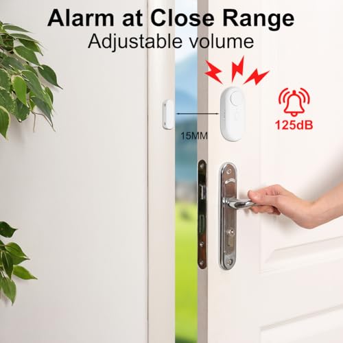 【Fünf Alarmmodi】 Sie können den 8-Sekunden-verzögerten Alarmmodus, den Türklingelmodus, den Türschließerinnerungsmodus, den Daueralarmmodus und den intermittierenden Alarmmodus einstellen. Die Lautstärke kann angepasst werden, die maximale Lautstärke: 125 dB, die minimale Lautstärke: 65 dB. Sie können den Modus und die Lautstärke entsprechend Ihren Anforderungen einstellen.