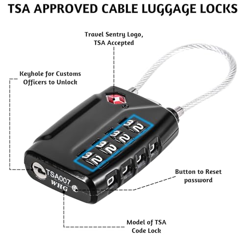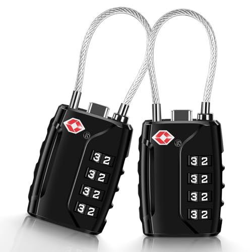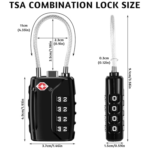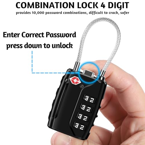 【Festes Gepäckschloss】Sie erhalten 2 Stücke schwarze TSA Schloss. Der Körper des 4-stelligen Zahlenschloss Vorhängeschlosses besteht aus einer hochfesten Zinklegierung, der Körper ist verdickt, die Härte ist gut, kollisions- und sturzsicher, nicht leicht zu beschädigen; Das Drahtseil ist flexibel und stark, hat einen Durchmesser von 3 mm und kann zur einfachen Verwendung durch die meisten Reißverschlusslöcher geführt werden.