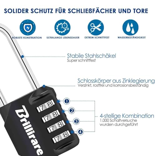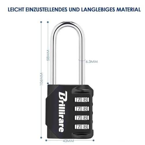 Brillirare Vorhängeschloss, Langer Bügel, Zahlenschloss 4 Stellig Vorhängeschloss Mit Zahlencode Metall, Schloss mit Zahlencode Wetterfest für Spind Fitnessstudio Werkzeugkasten (Schwarz)